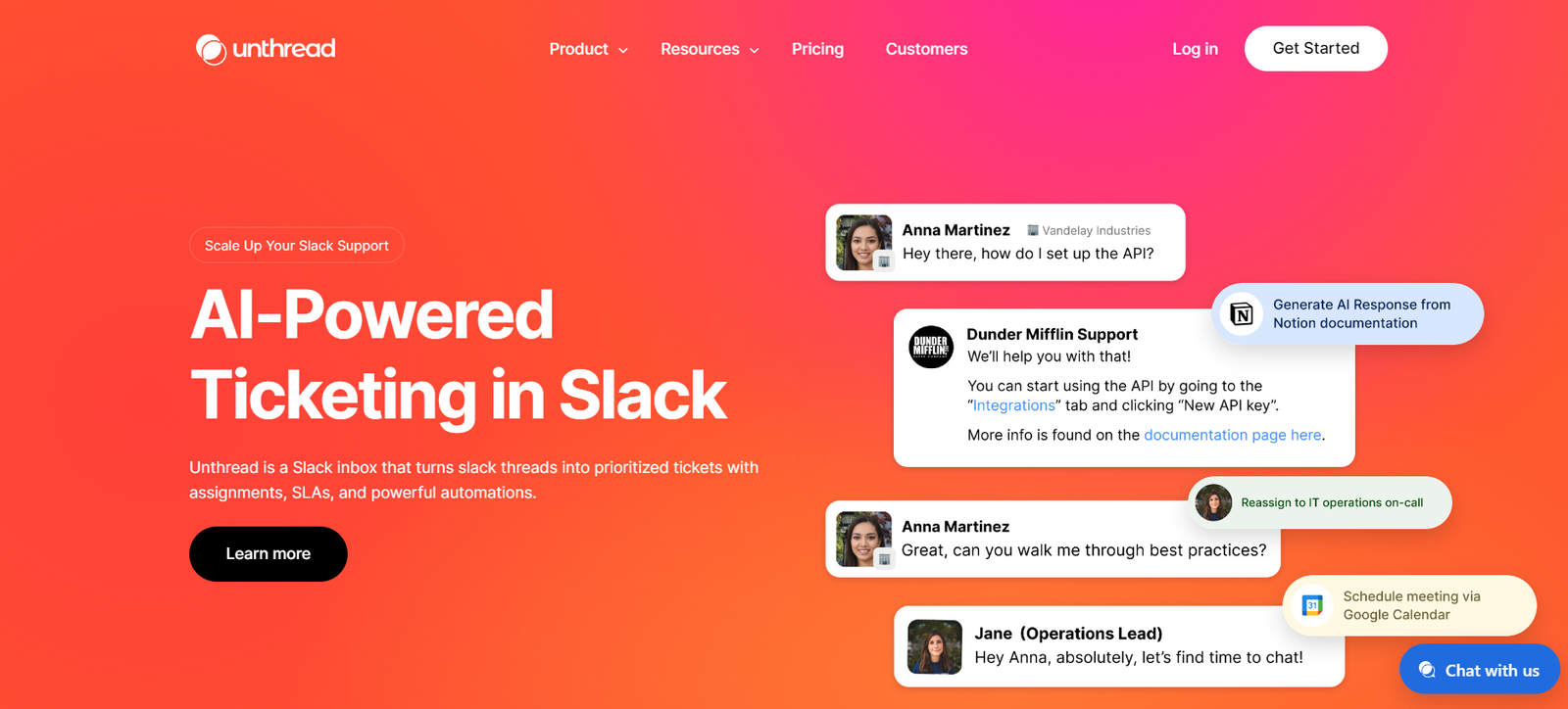 Unthread is an AI-powered support tool that integrates deeply with Slack, transforming Slack threads into prioritized tickets. It enables teams to manage customer support directly from Slack, with features like assignments, SLAs, and automation to streamline the support process. Unthread aims to make conversational support scalable and efficient, enhancing response times and customer satisfaction.