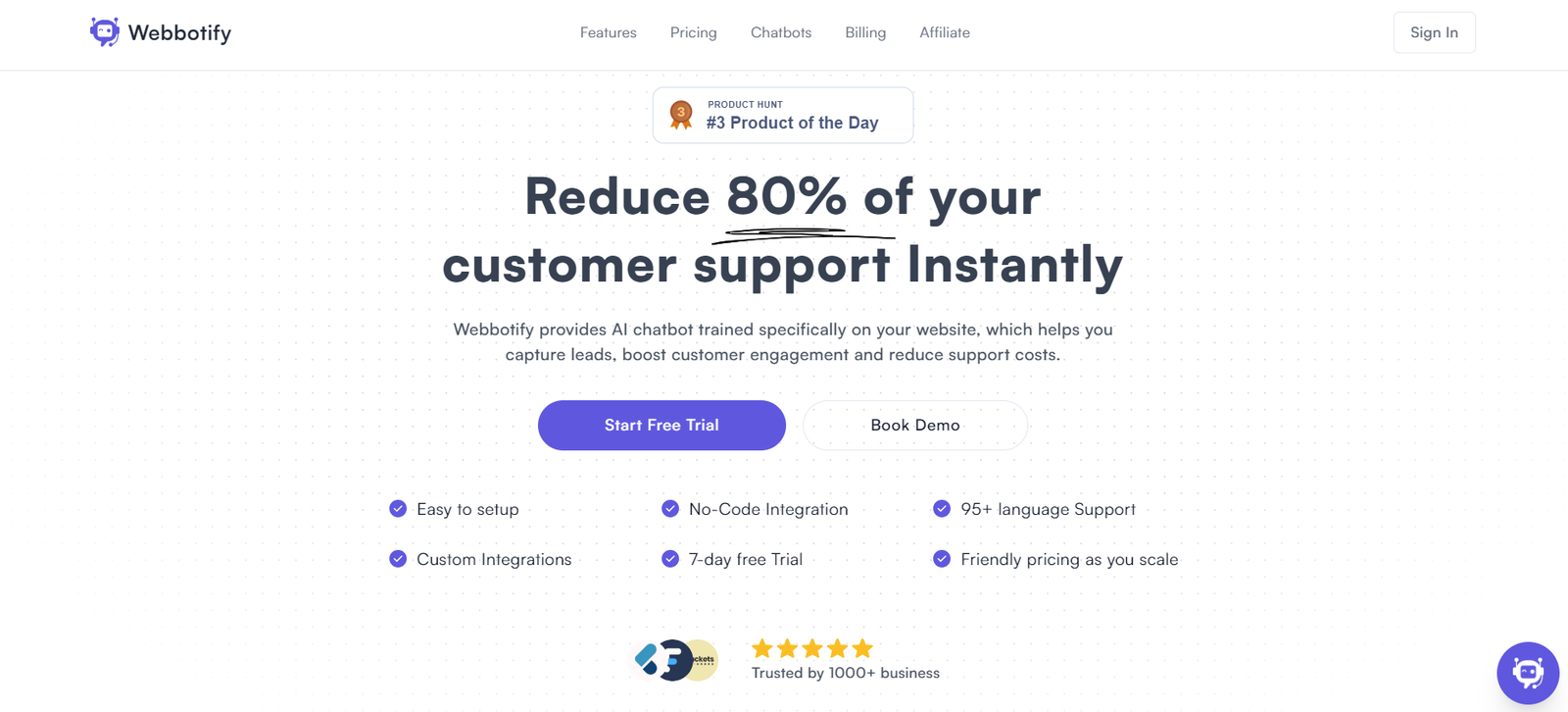 Webbotify is an AI-powered chatbot solution designed to streamline customer support, enhance lead capture, and boost customer engagement. It provides businesses with a customizable, multilingual chatbot that can be set up in just a few minutes without any coding skills. Webbotify’s chatbots are trained on your specific website content, ensuring accurate responses to customer inquiries.