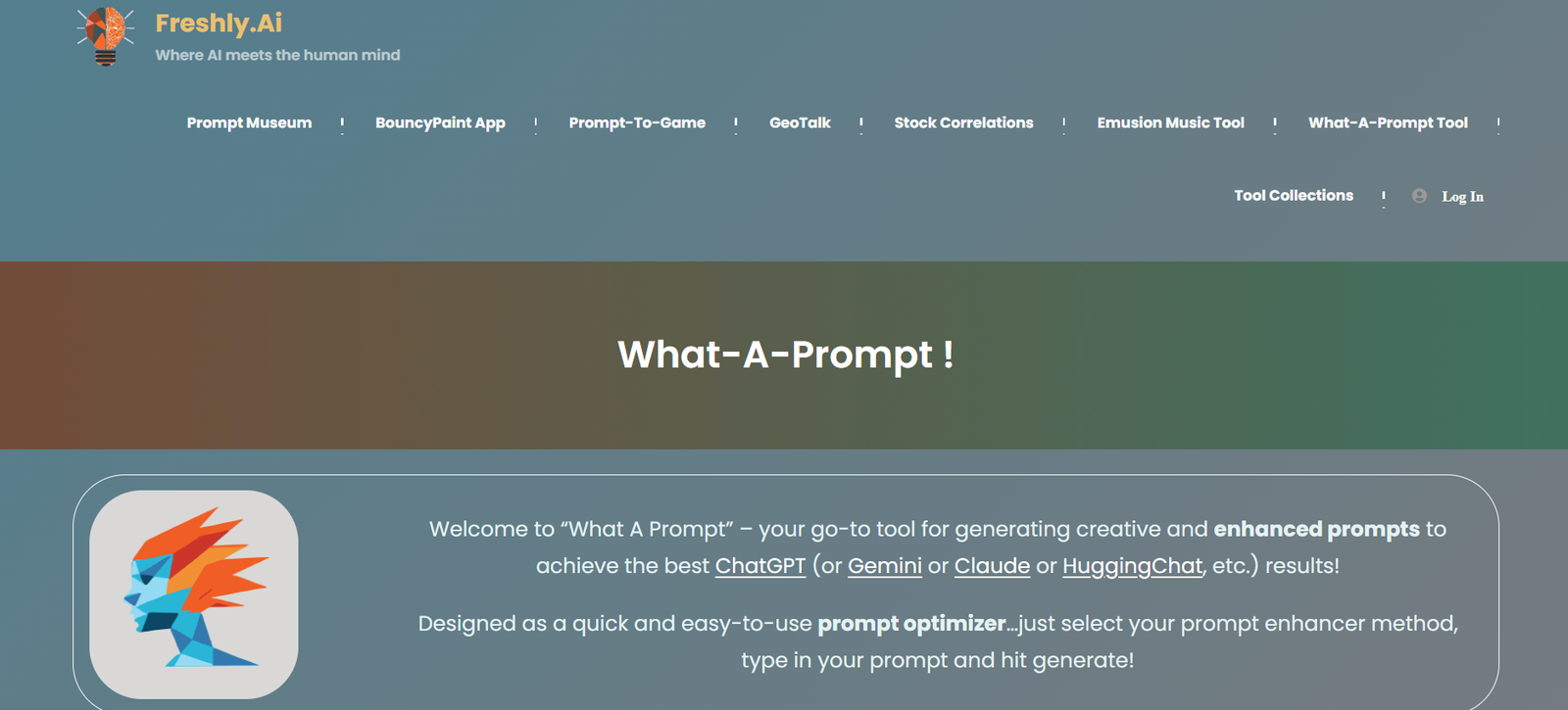 “What A Prompt” is an innovative tool designed to optimize and enhance prompts for ChatGPT, Gemini, Claude, HuggingChat, and other text generation applications. It provides a seamless experience for users by offering various methods to refine and improve their prompts. With a user-friendly interface, it caters to both text and image generation needs.