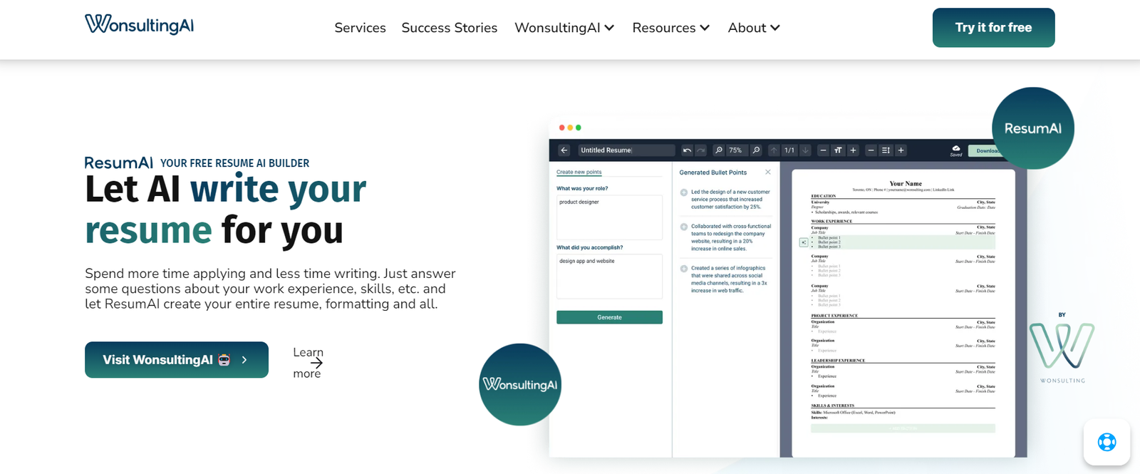ResumAI by Wonsulting is an AI-driven resume builder designed to streamline the resume creation process. By answering a few questions about your work experience and skills, ResumAI generates a professionally formatted resume. This tool allows users to focus more on job applications rather than spending time writing and formatting their resumes.