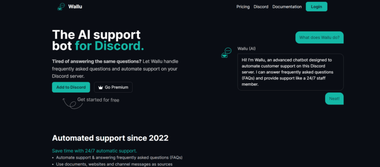 WalluBot is an AI chatbot for automating Discord server support, answering FAQs 24/7.
