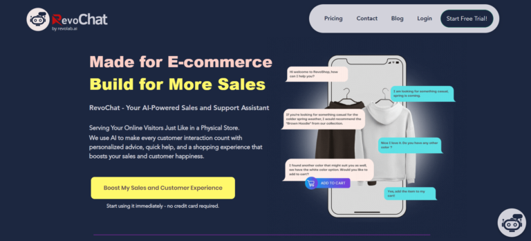 RevoChat is an AI-powered chatbot designed to enhance e-commerce sales and customer support.