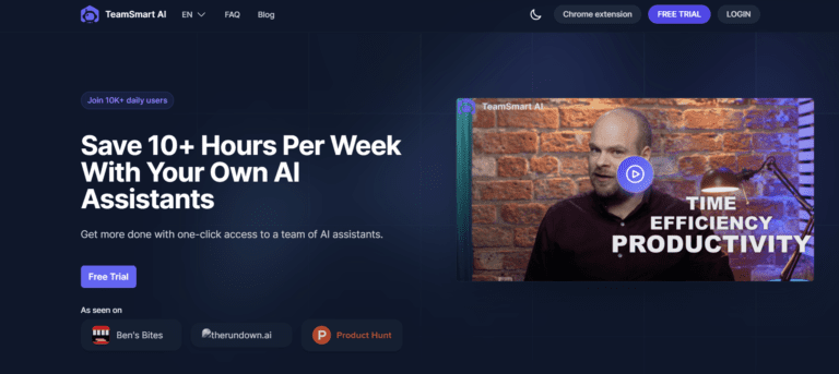 TeamSmart AI is a Chrome extension offering various AI assistants to boost productivity.