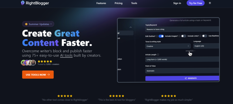 RightBlogger is an AI-powered platform offering 75+ tools for content creation, optimization, and promotion.