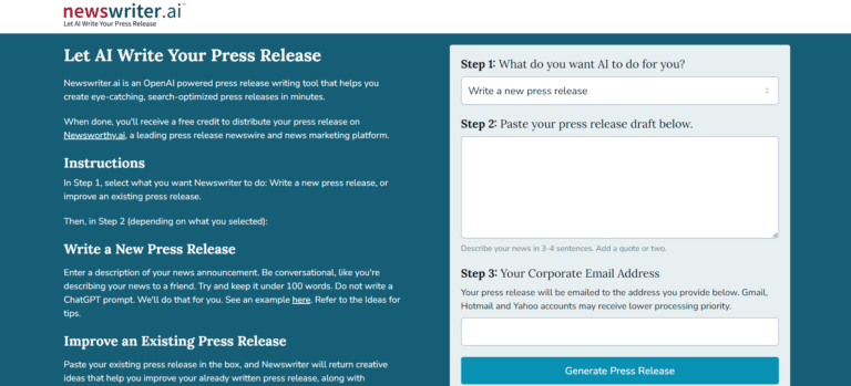 Newswriter.ai helps create SEO-optimized press releases quickly using AI.