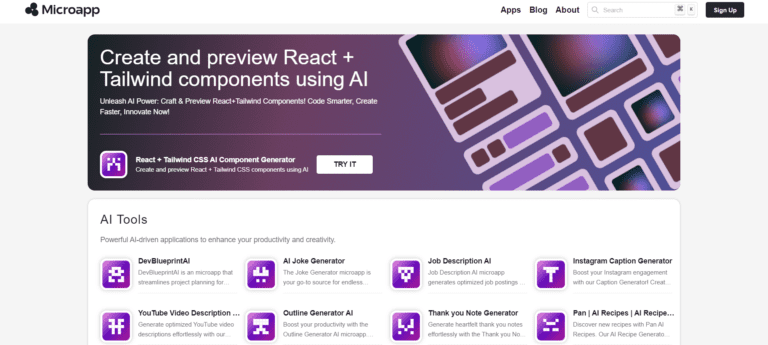 Microapp.io is an AI tool for creating and previewing React and Tailwind CSS components.