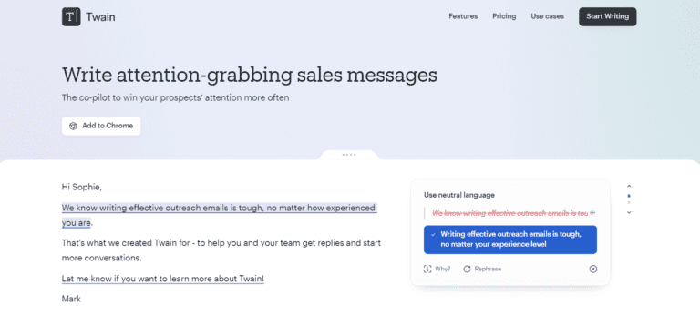 Twain AI is a communication assistant that helps craft compelling sales messages for better outreach.