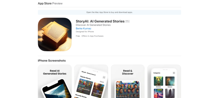 StoryAI allows users to discover and read AI-generated stories in 8 different categories.