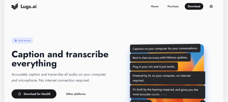Lugs.ai provides offline, accurate transcription and caption services tailored for the hearing impaired.